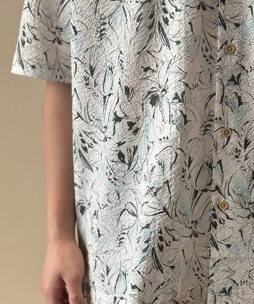 着心地の良いコットン100%の素材で制作したかりゆしシャツ。ゆとりのある首周りのデザインにシンプルなシャツデザインのためご年齢問わずにご着用いただけます。色違いや同柄ワンピースもございます。ご親族やご友人様とぜひお揃いコーディネートをお楽しみください。