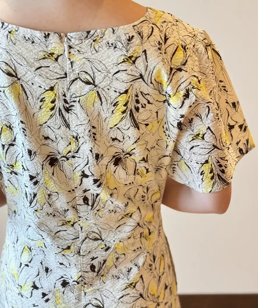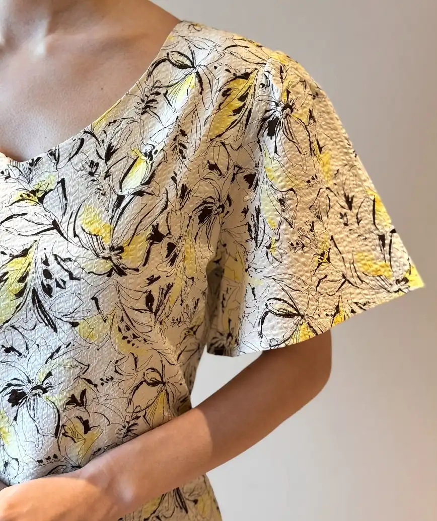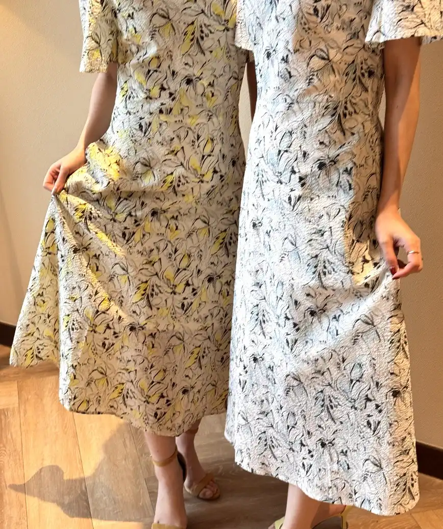 着心地の良いコットン100%の素材で制作したワンピース。程よい空きのあるVネックデザインやゆとりのあるフリルスリーブがご年齢問わずにご着用いただけます。色違いや同柄ワンピースもございます。ご親族やご友人様とぜひお揃いコーディネートをお楽しみください。