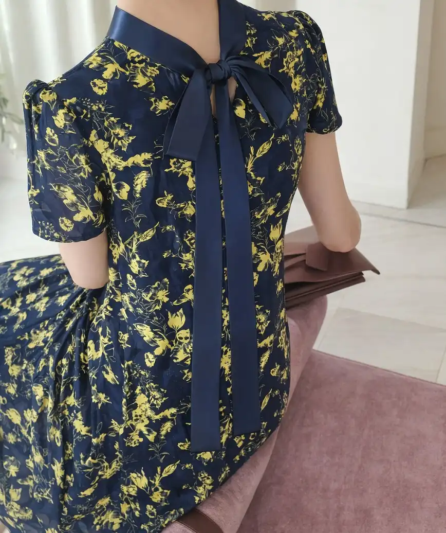 なめらかなジョーゼット素材に小花柄がプリントされた、エレガントに揺れ動く女性らしい印象の一着を作りました。リボンバックスタイルがポイントです。