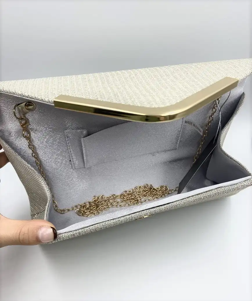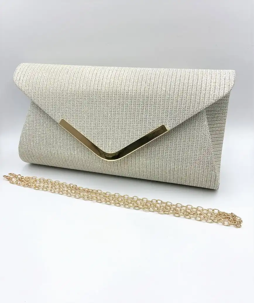 シルバーのきらめきが織り込まれた、華やかなクラッチ。横長で奥行きもあり、ご祝儀袋も安心して収納できるサイズです。