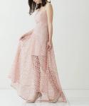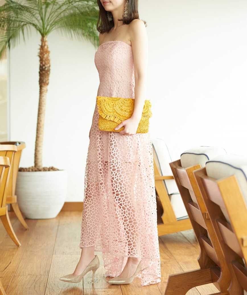 淡いピンクと透け感が二次会ならではのオシャレコーディネートを実現します♪インナースカートが短めなので、ミニ丈ドレスを悩んでいるけど勇気がでないという方にもおすすめ!しっかりとオーバースカートは長さがでますので、セクシーになりすぎずご着用いただけます。