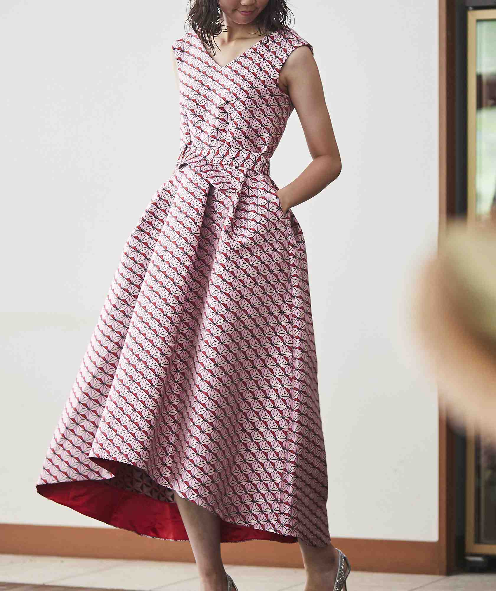 総柄のピンクドレスは珍しいドレススタイル♪ハリ感のある素材なので、カジュアルになりすぎることなく着用ができます!丈はミモレ丈で自由度もたかく、大ぶりのイヤリングを合わせてコーディネートも楽しめる1着です!