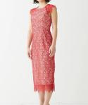 鮮やかな赤いリーフ柄のレースが目を引く一着。身長を気にせずさらりと着られるデザインで、こなれ感のある印象に。海や太陽の存在を感じる、開放的な会場にぴったりのドレスです。