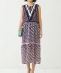 マリン風のレトロな柄と、軽やかな生地感が夏にピッタリの一着。胸元のパイピングが全体を引き締めてくれます。生地に伸縮性はありませんが、ウエスト部分はゆったり目につくられているので安心です。