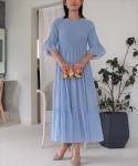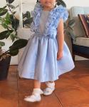やわらかいブルーカラーと肩のフリルがとってもキュート。背中で結ぶリボンもポイントです。