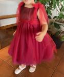 【キッズ】ショルダーリボンチュールミディアムドレス-レッド-90サイズ
