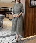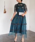 レトロで愛らしい刺繍のデザインが目を引く一着。深みのあるグリーンですが、柔らかく重ねられたチュールが軽やかさと涼しさをプラスしてくれ