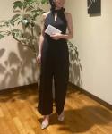 背中がざっくりと開いたバックスタイルが印象的なパンツドレスです。