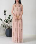 淡いピンクにグリーン、イエローの刺繍が華やかな一着。特徴的なネックデザインで背中は空きの多いドレスです。花嫁様の衣裳としてもおすすめのドレスです!
