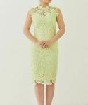 ハイネックデザインに透け感の少ない上品な総レースドレス。ホテル式のような格式高い披露宴にもご着用いただけるシックイエローです。