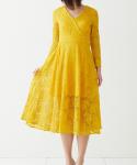 Vネックデザインで少しカジュアル感のでるイエローレースドレス。柔らかい総レースがレディライクな印象に。レースドレスに珍しく長袖デザインのため季節問わずご着用いただけます。グリーンに映えるイエローレースはガーデンや屋外挙式におすすめのドレスです。